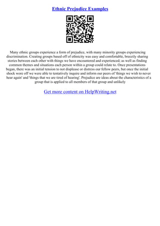 The document discusses the concept of prejudice, highlighting its negative impact on individuals and society, often rooted in stereotypes and lack of knowledge. It provides historical and contemporary examples of prejudice based on gender, race, and ethnic backgrounds, illustrating how discriminatory practices have evolved over time. The author reflects on the importance of acknowledging and combating prejudice to foster a more inclusive society.