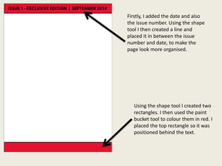1) The document describes the process of designing a magazine cover and contents page for a school magazine called "School Success". Key elements included adding a masthead, headline, images, school logo, and social media links.