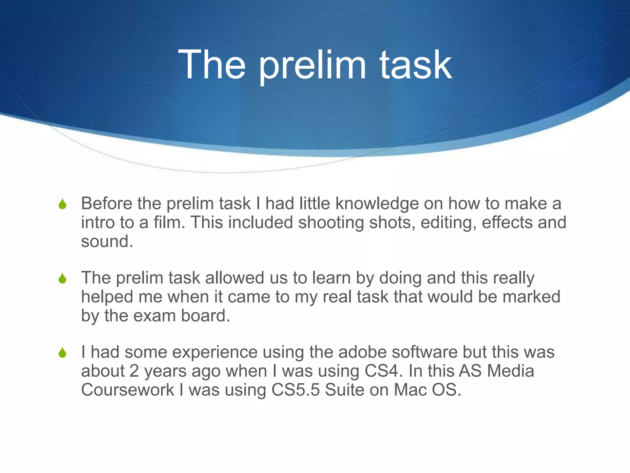 The document discusses the learning progression from a preliminary film task to a finalized film project, highlighting improvements in camera techniques, equipment usage, and software skills. It emphasizes practical experience gained through the prelim task, which included understanding shots and editing techniques that contributed to creating a more polished main task. Additionally, mistakes from the prelim task served as valuable lessons that informed better production choices in the main task.