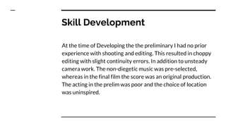 The document discusses the learning and skill development that occurred between an initial preliminary film project and a final film project. It notes that for the preliminary, the author had no prior experience with filming or editing, which led to issues like choppy editing, unsteady camera work, and poor acting. However, working on the preliminary served as a valuable learning experience, helping the author gain experience and skills in areas like operating camera equipment steadily, using editing software, and planning shots and lighting - which allowed for a significant improvement in quality between the preliminary and final film.