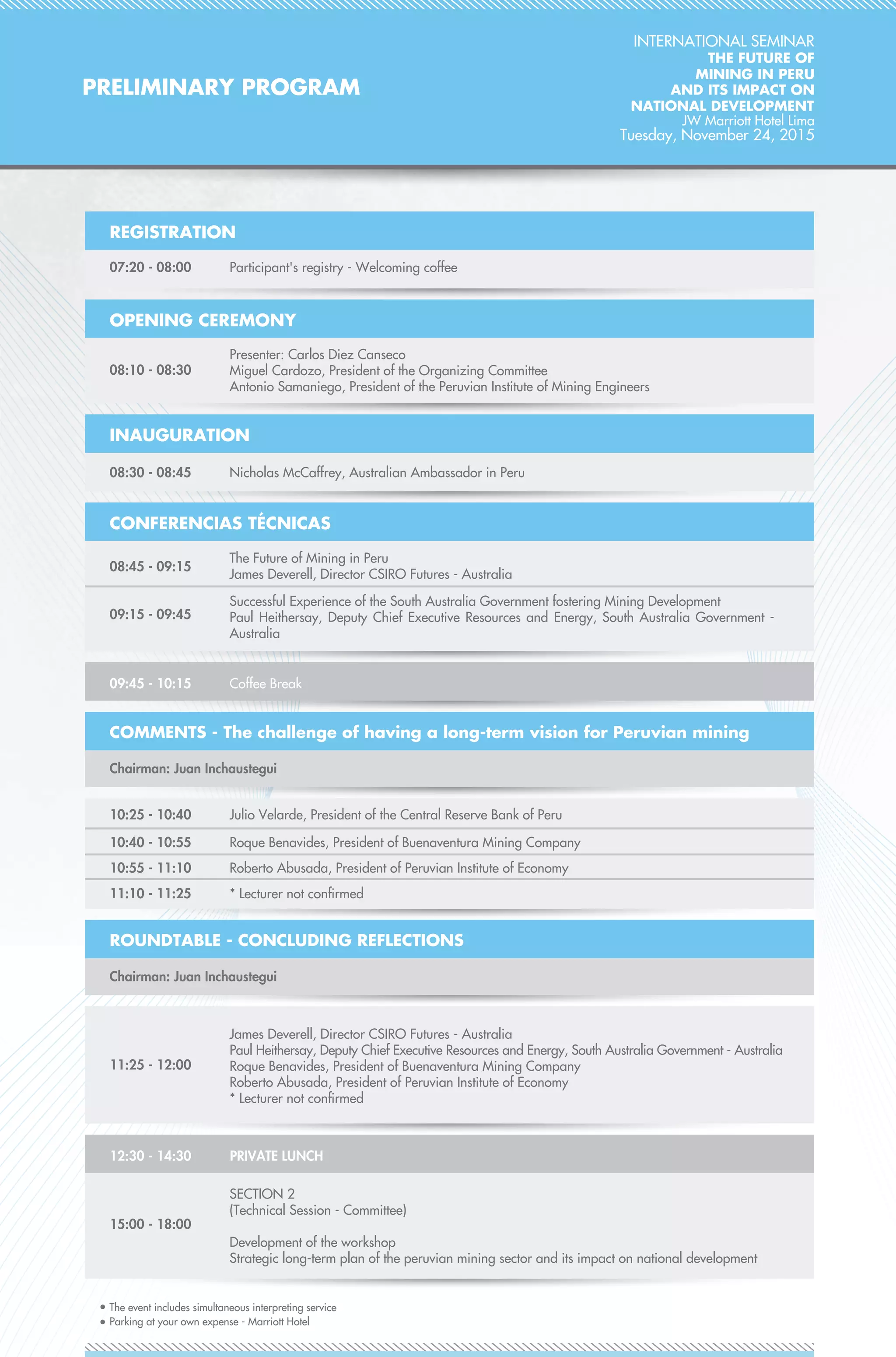 The document outlines a preliminary program for an international seminar on the future of mining in Peru, scheduled for November 24, 2015, at the JW Marriott Hotel in Lima. It includes details on registration, the opening ceremony, various technical conferences, and prominent speakers such as Nicholas McCaffrey and Julio Velarde. The event emphasizes strategic long-term planning for the Peruvian mining sector and its impact on national development.