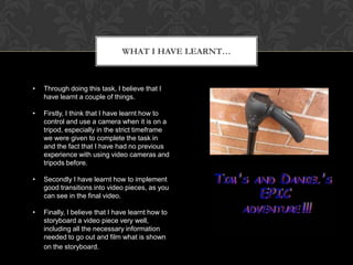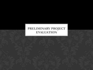 This document provides a preliminary evaluation of a project. It summarizes that the author learned how to use a video camera on a tripod, implement transitions, and storyboard a video. It also discusses the success of presenting a range of shots and meeting the brief. Areas for improvement include not meeting the one minute time limit and adding more transitions. In conclusion, the brief requirements of showing characters opening a door and sharing dialogue were satisfied.
