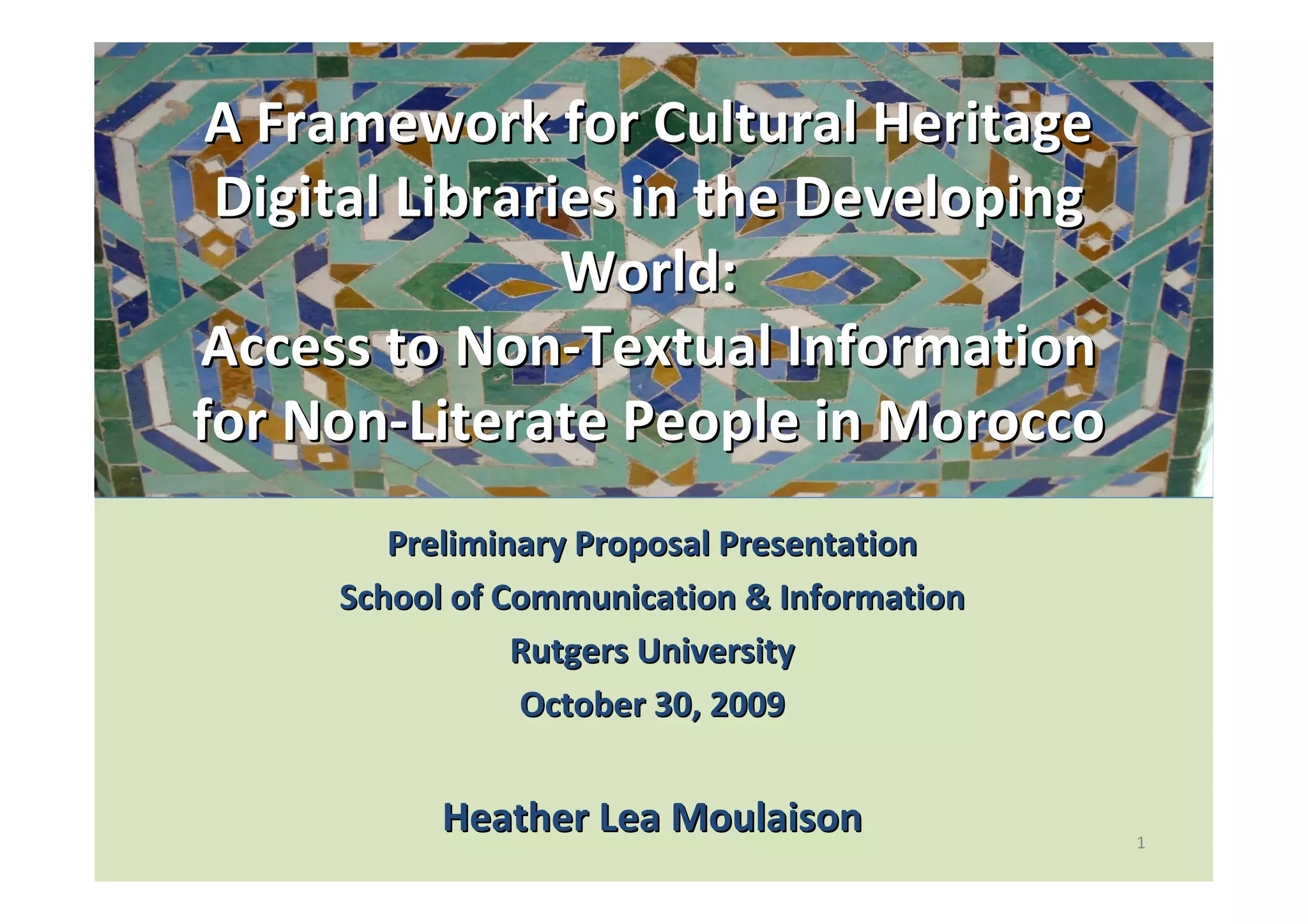 This document provides background information and outlines a proposed study on developing digital libraries to provide access to cultural heritage materials for non-literate people in Morocco. It begins with an overview of the author's experience in Morocco and rationale for the study. It then reviews relevant literature on concepts of literacy, culture, cultural heritage and digital libraries. The document proposes research questions about how cultural usability and library and information science theories can inform the design of such a digital library system and interface. It concludes with an outline of the proposed ethnographic methodology for the study.