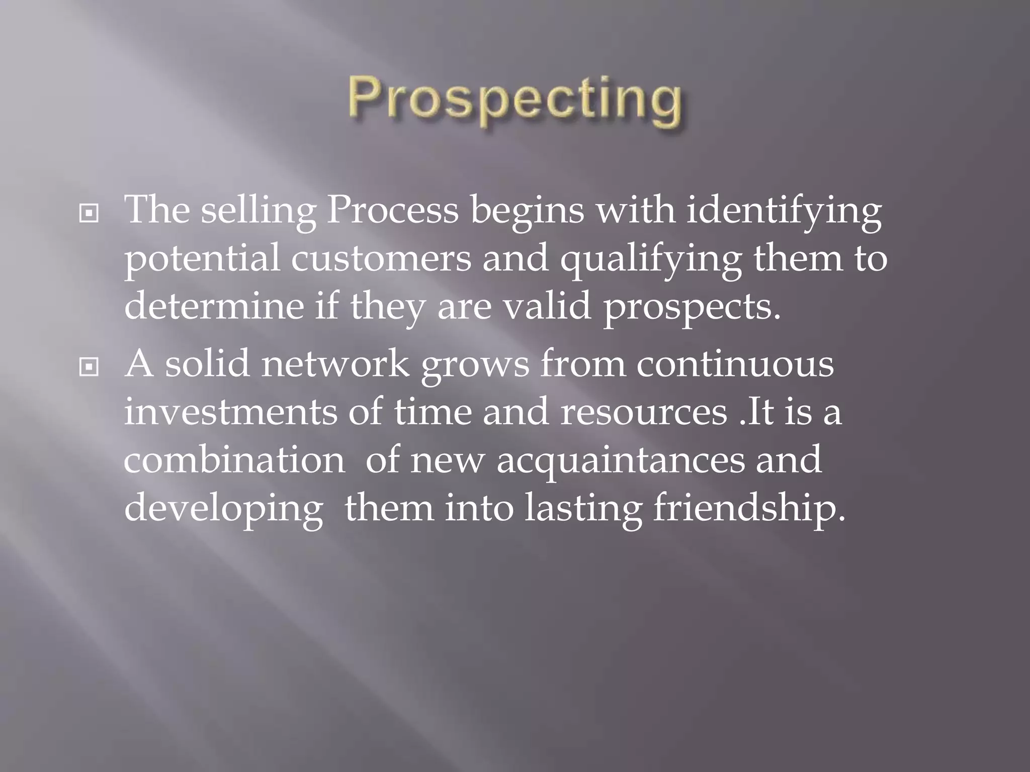 1) The selling process begins with identifying potential customers and qualifying them to determine if they are valid prospects. Common sources of prospects include present, former and referral customers, as well as cold calling, directories, and trade shows.