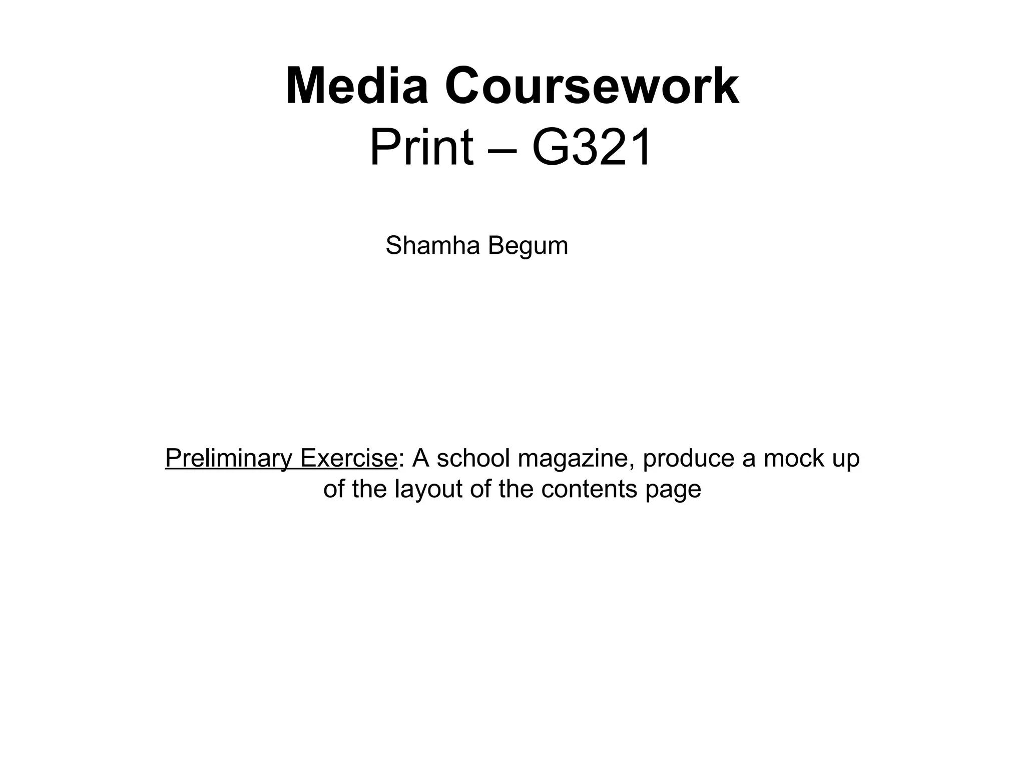 The document provides details about a student's preliminary research and exercise for a media coursework assignment to create a mock contents page for a school magazine. It discusses conventions of magazine design like mastheads, images, and colors. It also compares the layouts of sample education and sports magazines, noting differences in brightness, organization, and intended audiences. Guidelines are provided for what makes an effective school/college magazine, such as relevant images, logos, prices, and secondary headlines. A proposed mock-up is outlined with example article topics, colors, and a potential cover image.