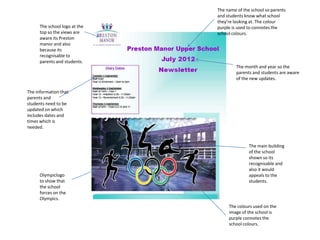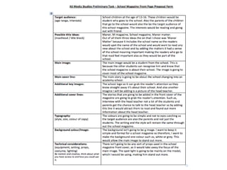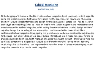 The document describes a preliminary task to create a school magazine, including a front cover and contents page. It discusses how completing this task provided experience with Photoshop and learning how to collect information to design a magazine. Research was conducted on typical school magazine formats. A draft design was then created, incorporating the research, to help finalize ideas before creating the actual magazine. This process helped prepare ideas and allowed mistakes to be identified and improved upon for a future music magazine project.