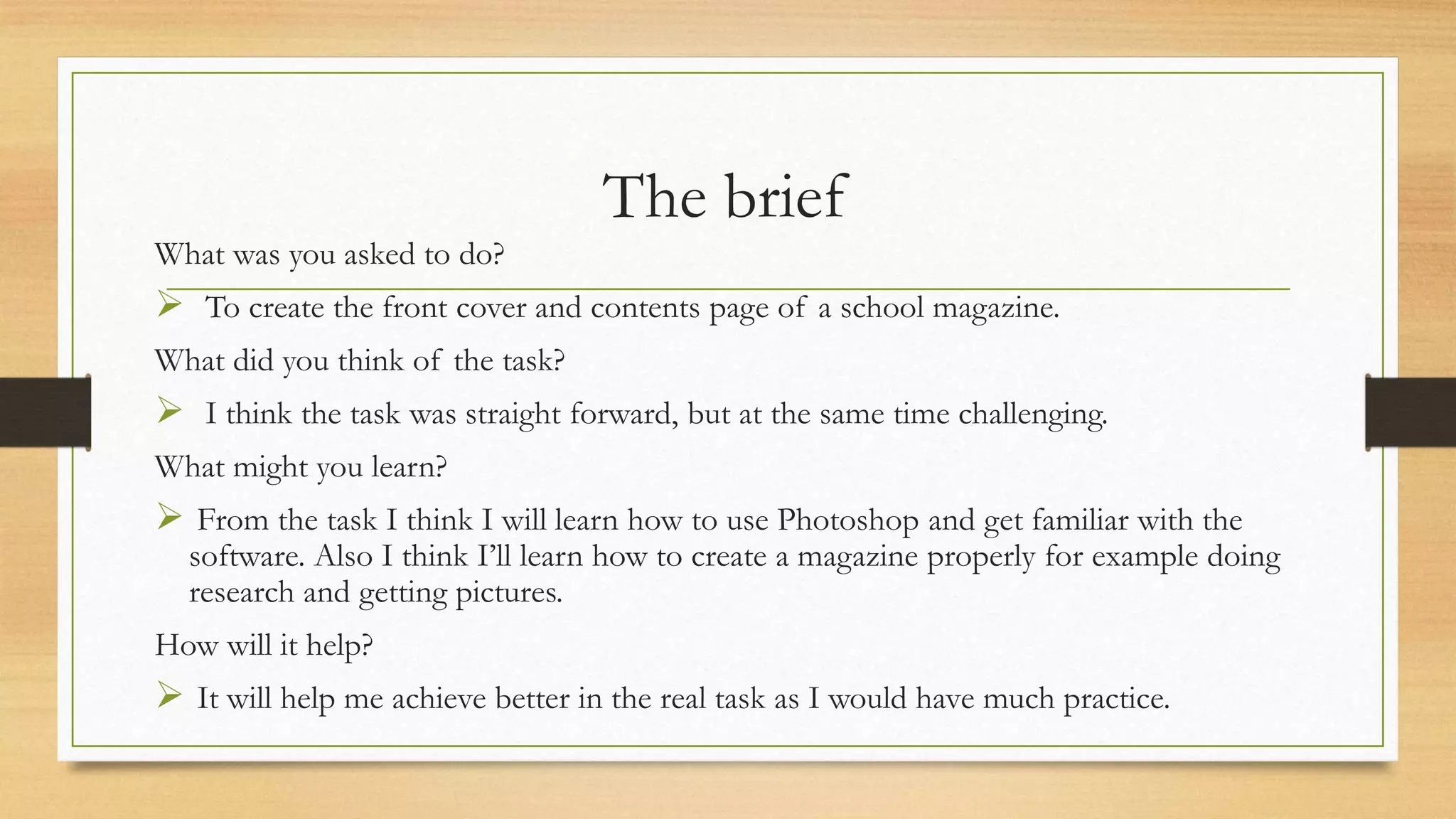 The document discusses a student's task to create the front cover and contents page for their school magazine. The student thinks the task will be both straightforward but also challenging, and that it will help them learn skills with Photoshop and how to properly design a magazine. Completing the task will also help the student improve for future real assignments through gaining practice.