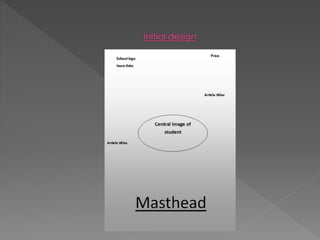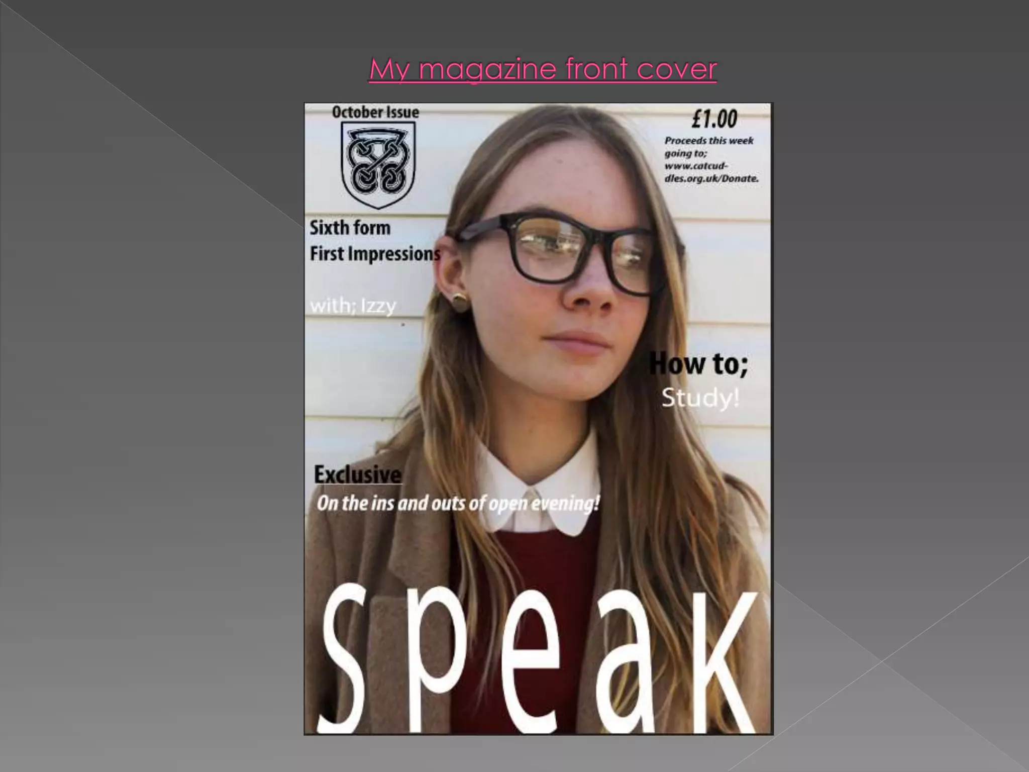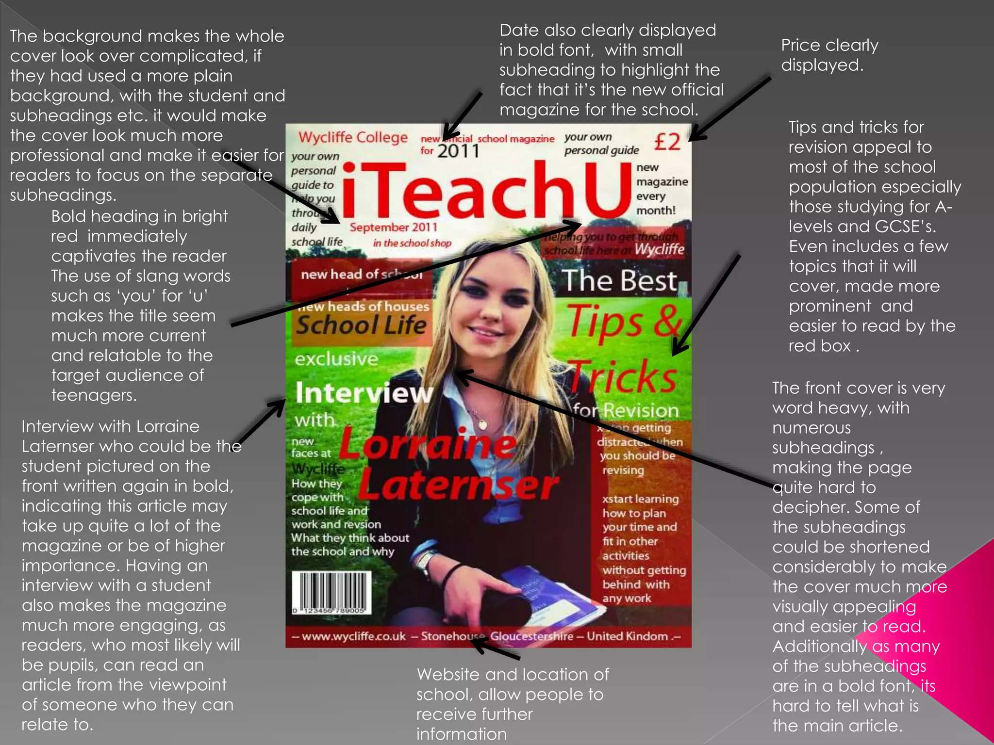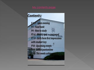 The student designed a front cover for a school magazine that featured a close-up photo of a student as the focal point with additional text-based headlines around the edges relating to school topics. They also created a contents page with article titles and page numbers listed in bold black font on a simple background. With more time, the student would improve the front cover by capitalizing title words and changing fonts, and the contents page by adding relevant photos and modifying the font style and color.