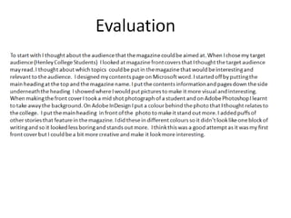 The document summarizes the key elements and conventions used in a magazine mock-up cover and contents page design. It notes that the central image on the cover looks straight ahead to create eye contact, and that the barcode and pricing are in the lower corner as is conventional. The contents page uses bold numbering, subtitles for sections, and three images to break up the page. It also identifies the target audience for the magazine as college students.
