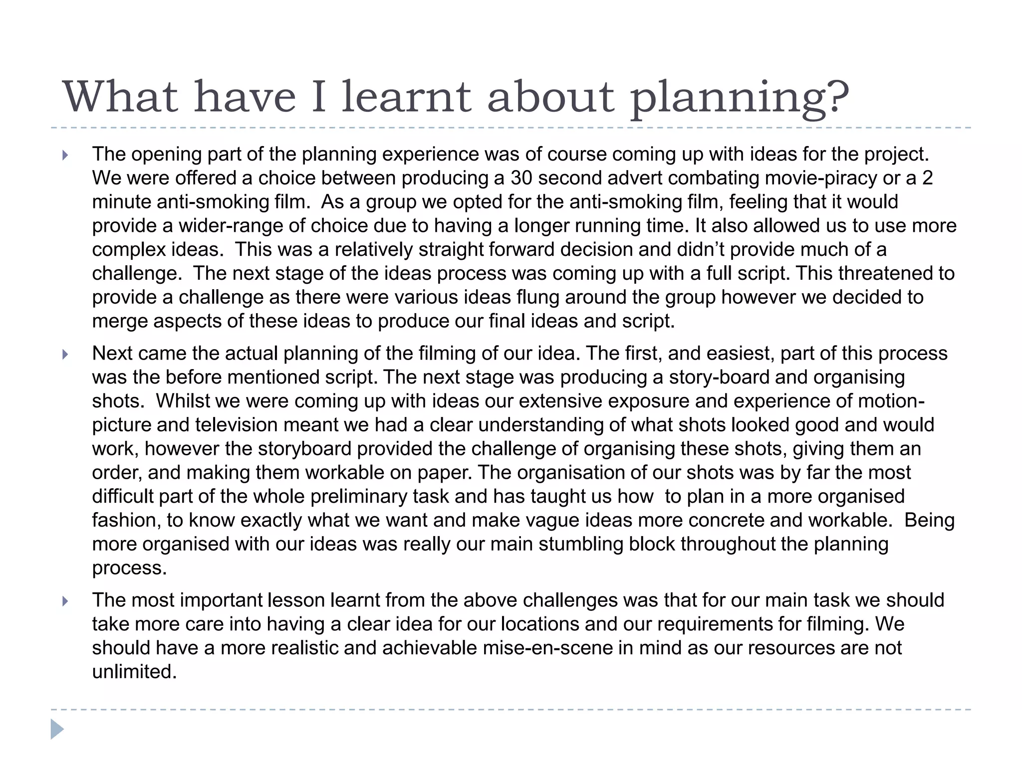 The document discusses what was learned from completing a preliminary planning and filming task. Key lessons included:
