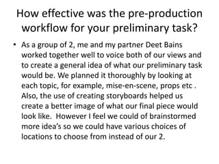 Josh evaluated his group's preliminary task process. They planned thoroughly using storyboards and considered location options, though could have brainstormed more. They filmed using an iPad, but it picked up background noise. Josh learned to choose locations without excess light and to use a tripod. They edited in iMovie, which helped produce a better final product than other software. Overall, Josh felt the task met its criteria and he learned various filming techniques and skills in editing through iMovie that will help with future projects.