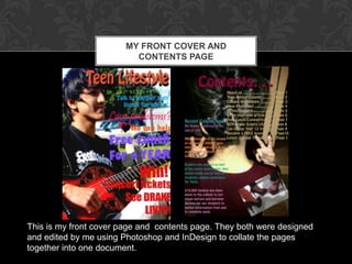 The document discusses the process of creating a school magazine cover and contents page. It describes using various software programs like Photoshop, InDesign, and Publisher to design and layout the pages. Specifically, it discusses taking photos with a digital camera and editing them in Photoshop. It also covers using InDesign to combine pages into one document and format the text and images on the contents page. The student learned skills like photo composition, editing images, laying out magazine pages, and collating documents using these programs.