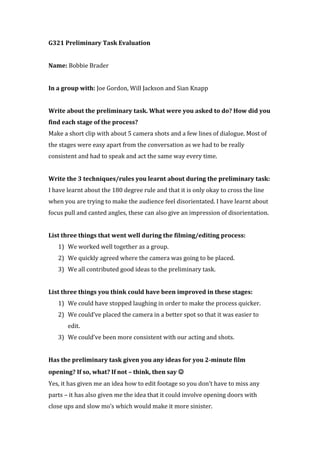 The document summarizes Bobbie Brader's experience with a preliminary filmmaking task done in a group. It discusses the stages of filming a short clip with dialogue, the techniques learned like the 180 degree rule, things that went well like collaboration, and areas for improvement such as being more consistent in acting. The task provided ideas for Bobbie's 2-minute film opening, like how to edit smoothly and using close-ups and slow motion for an ominous feel.