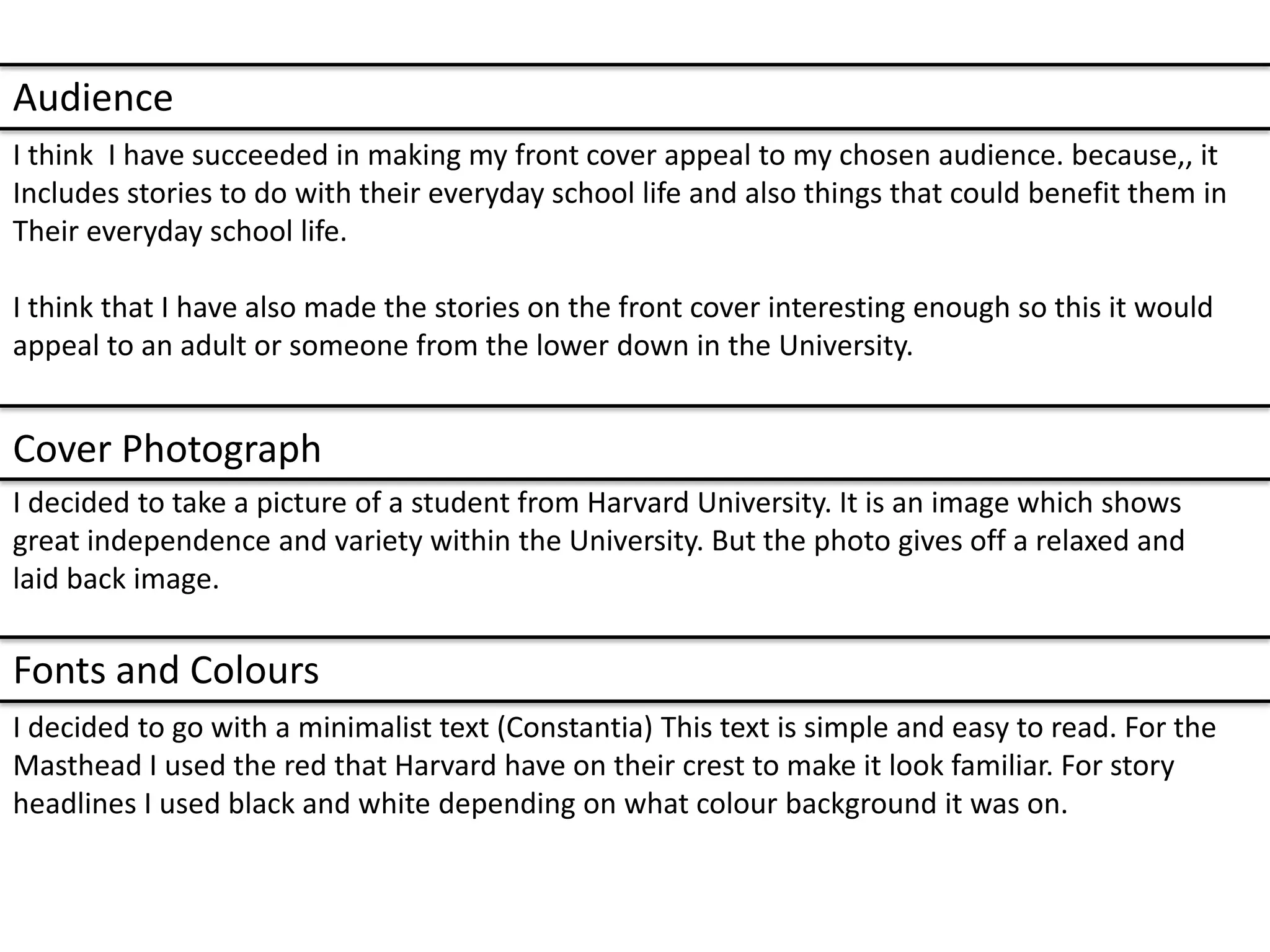 The document summarizes the design choices made for a magazine cover targeting Harvard University students. It includes stories about everyday student life to appeal to its target audience of university students. The cover photograph features a relaxed Harvard student to represent the independence and diversity of the university. A minimalist font is used for readability, and the masthead matches Harvard's red crest color with black and white headlines on different backgrounds.
