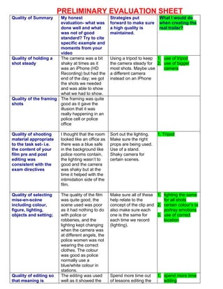 The document provides a preliminary evaluation of a student film project. [1] It evaluates various technical and creative aspects of the film such as camera work, framing, lighting, editing, sound, and acting. [2] While some elements like framing and editing were done well, other areas needed improvement such as keeping the camera steady, lighting consistency, and using a location more appropriate to the story. [3] The evaluation also reflects on group dynamics, noting an initial clash of ideas but that overall the group worked well together to complete the project.