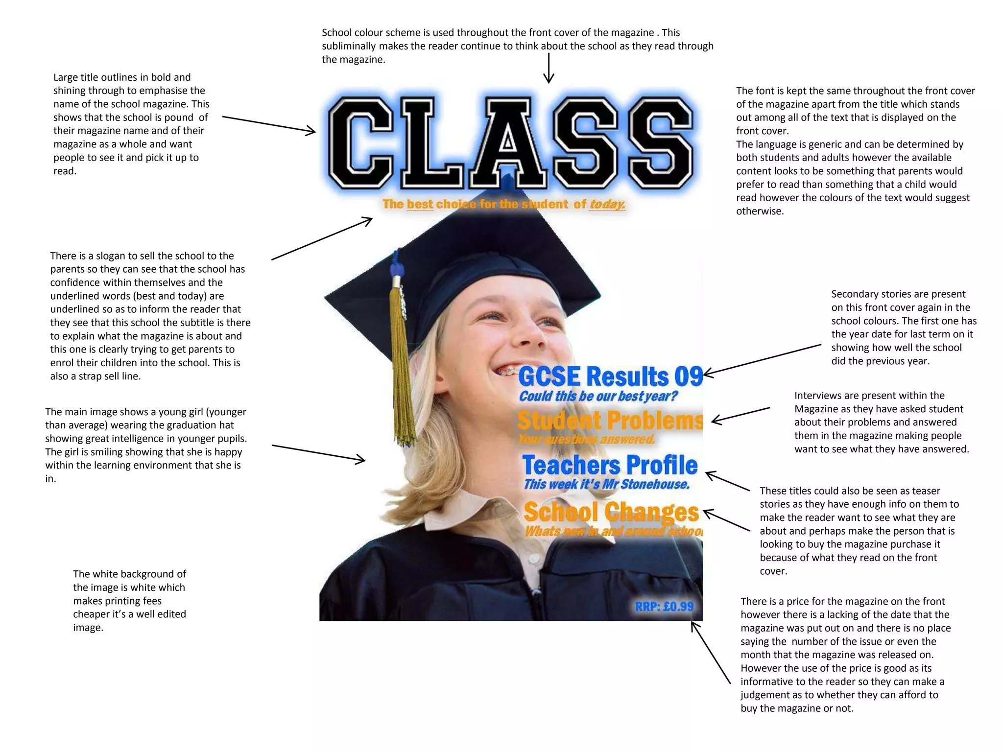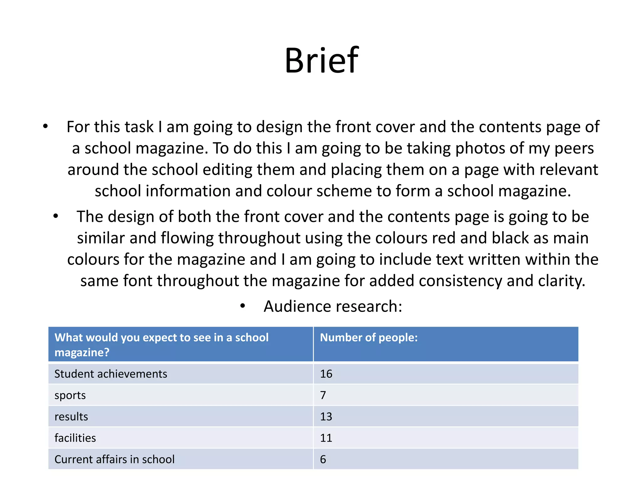 The document outlines plans for designing the front cover and contents page of a school magazine. It will include photos of students edited and placed with school information and a red and black color scheme. The front cover and contents page designs will be similar, with consistent fonts. Audience research found that students and parents most want to see student achievements, sports, results, facilities, and current school affairs. Sketches provided show ideas for layouts of the front cover with a student photo and headlines, and contents page listing stories.
