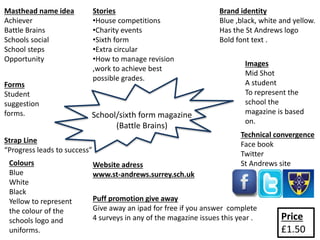 The document outlines details for a school/sixth form magazine including the proposed masthead name of "Battle Brains", a logo featuring the colors blue, black, white and yellow to represent the school, and key stories that would be covered such as house competitions, charity events and academic tips. It also provides pricing at £1.50 and plans for promotions through social media and a website while collecting student feedback via suggestion forms.