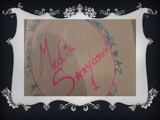 This storyboard document outlines 11 still shots for a preliminary thriller task. Shot 1 establishes the main character's fear and feeling of being trapped outside a door. Shot 2 shows a stick breaking to establish a second actor and create tension. Shot 3 shows a microphone to portray the character as a journalist and symbolize how social media is constantly around us. Shot 4 shows two people arguing and being watched, increasing tension and symbolizing relationships breaking down due to social pressure. The remaining shots continue building mystery, suspicion, and symbolism through various angles and implications to develop the plot and themes of privacy, watching, madness, and new life within a dark context.