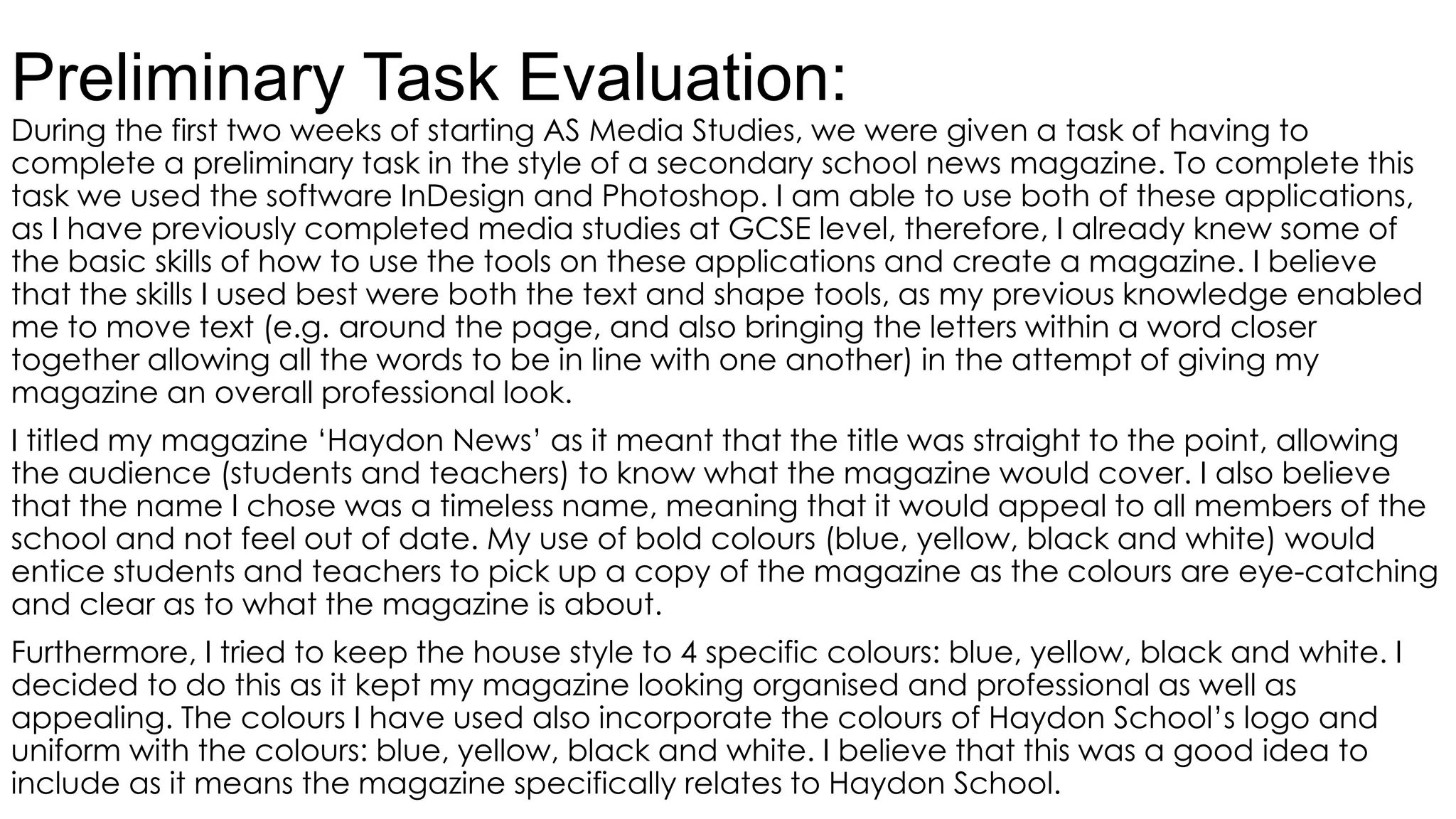 The document summarizes the author's process for completing a preliminary task to create a magazine for their secondary school. Some key points: