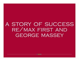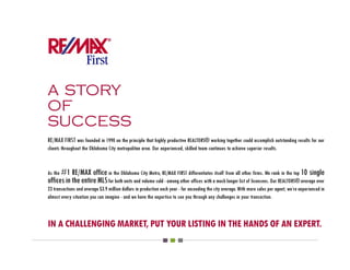 This document summarizes information about RE/MAX First, a real estate office in Oklahoma City, and one of its top agents, George Massey. RE/MAX First was founded in 1990 and has achieved success as the #1 RE/MAX office in the Oklahoma City metro area, ranking in the top 10 offices for units and volume sold. The document provides details about George Massey's experience and accomplishments, testimonials from