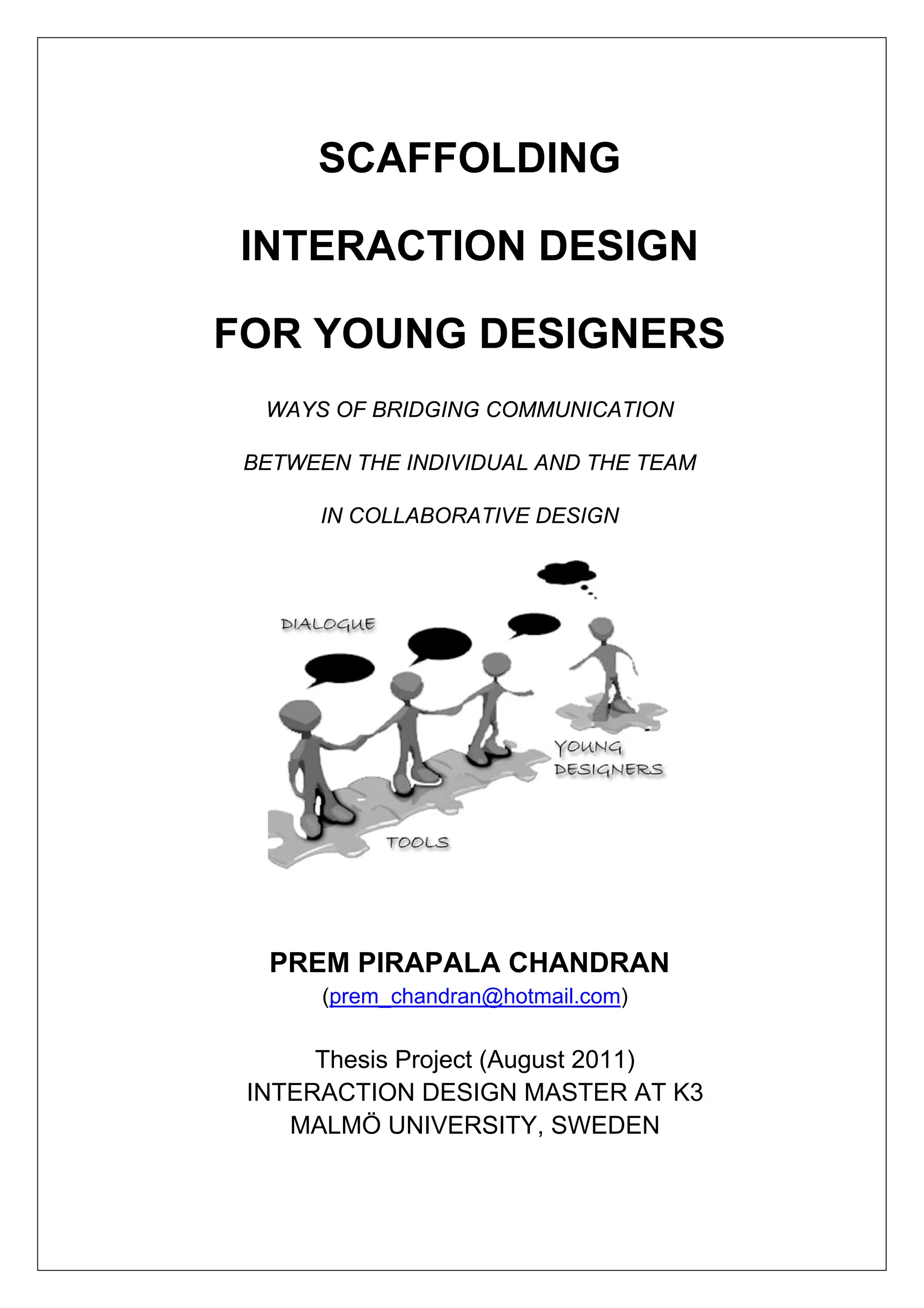 This document summarizes a thesis project aimed at scaffolding interaction design skills for young designers. The author aims to teach interaction design to students aged 12-16 and observe how they respond to designing for real problems in a collaborative team environment. As a teacher, the author investigates approaches to bridge communication gaps between team members and support them in designing purposefully. Through a series of workshops, students are exposed to interaction design methods and tools to elicit design dialogue. The author observes that framing empathic experiences around the design problem enhances student motivation more than a discrete curriculum. Scaffolding with social media and tangible aids helps ground imagination and bridge team dynamics. For interaction design to be taught meaningfully, eliciting empathy for users through
