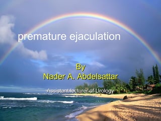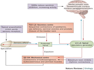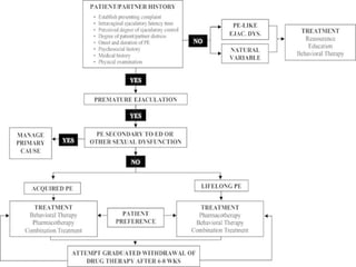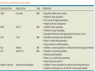 Ejaculation involves three phases - emission, bladder neck contraction, and expulsion. Premature ejaculation (PE) is defined as ejaculation occurring within about 1 minute of penetration that the man has little control over, causing distress. The pathophysiology of PE is not fully understood but may involve genetic, psychological, hormonal, penile sensitivity, and prostatic factors. PE is diagnosed based on history and can be evaluated using tools like the Premature Ejaculation Diagnostic Tool. Treatment includes behavioral therapies like stop-start and squeeze techniques as well as pharmacotherapies.