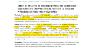 This document discusses premature ventricular complexes (PVCs) and catheter ablation for treating PVCs. It defines PVCs as early ventricular depolarizations that do not necessarily lead to contractions. Common causes of PVCs include electrolyte abnormalities, ischemia, and cardiomyopathies. The prevalence of PVCs increases with age and longer monitoring. Frequent PVCs can impair left ventricular function and cause a PVC-induced cardiomyopathy. Catheter ablation is an effective treatment for eliminating PVCs when medications are ineffective or not tolerated.