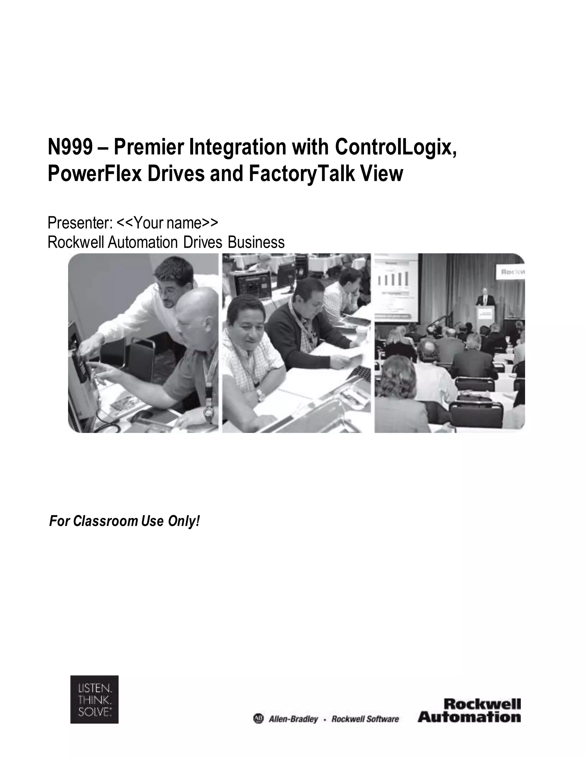 This document provides instructions for a lab that demonstrates integrating a PowerFlex 755 drive with a ControlLogix controller using RSLogix 5000 software. The lab includes steps for connecting hardware, creating an RSLogix 5000 project with an integrated drive profile for the PowerFlex 755, configuring network I/O between the devices, and using FactoryTalk View ME to monitor and control the drive. Optional sections provide additional exercises for explicit messaging, viewing drive web pages, a conveyor application example, and using a non-AB drive.