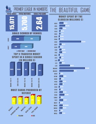 The document provides statistics about the Premier League including goals scored by home and away teams, transfer spending, cards given by referees, money spent by clubs, titles won by clubs, and results by venue. Manchester United have spent the most money on transfers, scored the most goals, and won the most titles in the Premier League.