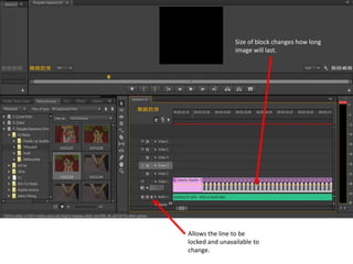 This document provides instructions for a slideshow tool. It explains that different sized blocks change the duration of images, the eye icon allows certain parts to be seen or hidden, and videos can be sped up or slowed down in different sections to control the pace. Pictures and music can be added to match and images can be scaled to fit the frame or zoom in/out.