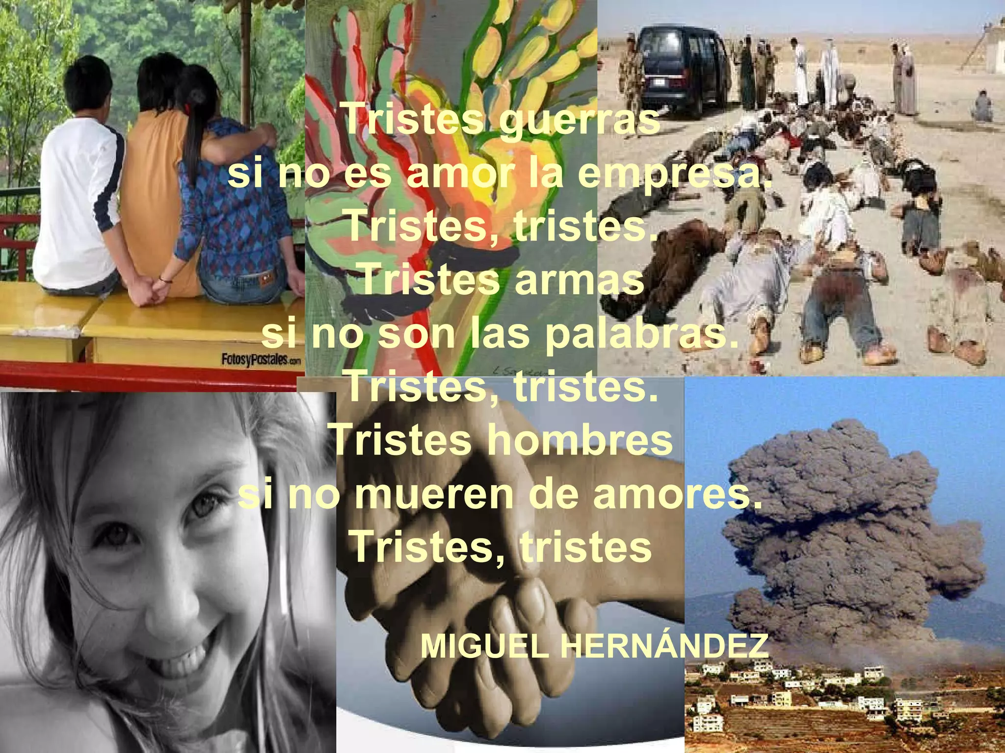 Tristes guerras sino es amor la empresa. Tristes, tristes. Tristes armas si no son las palabras. Tristes, tristes. Tristes hombres si no mueren de amores. Tristes, tristes MIGUEL HERNÁNDEZ
