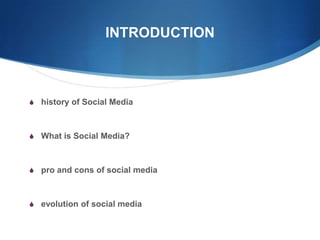 The document provides an overview of the history and current state of social media. It discusses the evolution of social media from early platforms like CompuServe and AOL in the 1960s-1980s to major current social platforms. The document also outlines pros and cons of social media marketing for brands, such as the ability to engage with audiences but also risks of negative comments. It examines whether business-to-business companies are investing in social media.