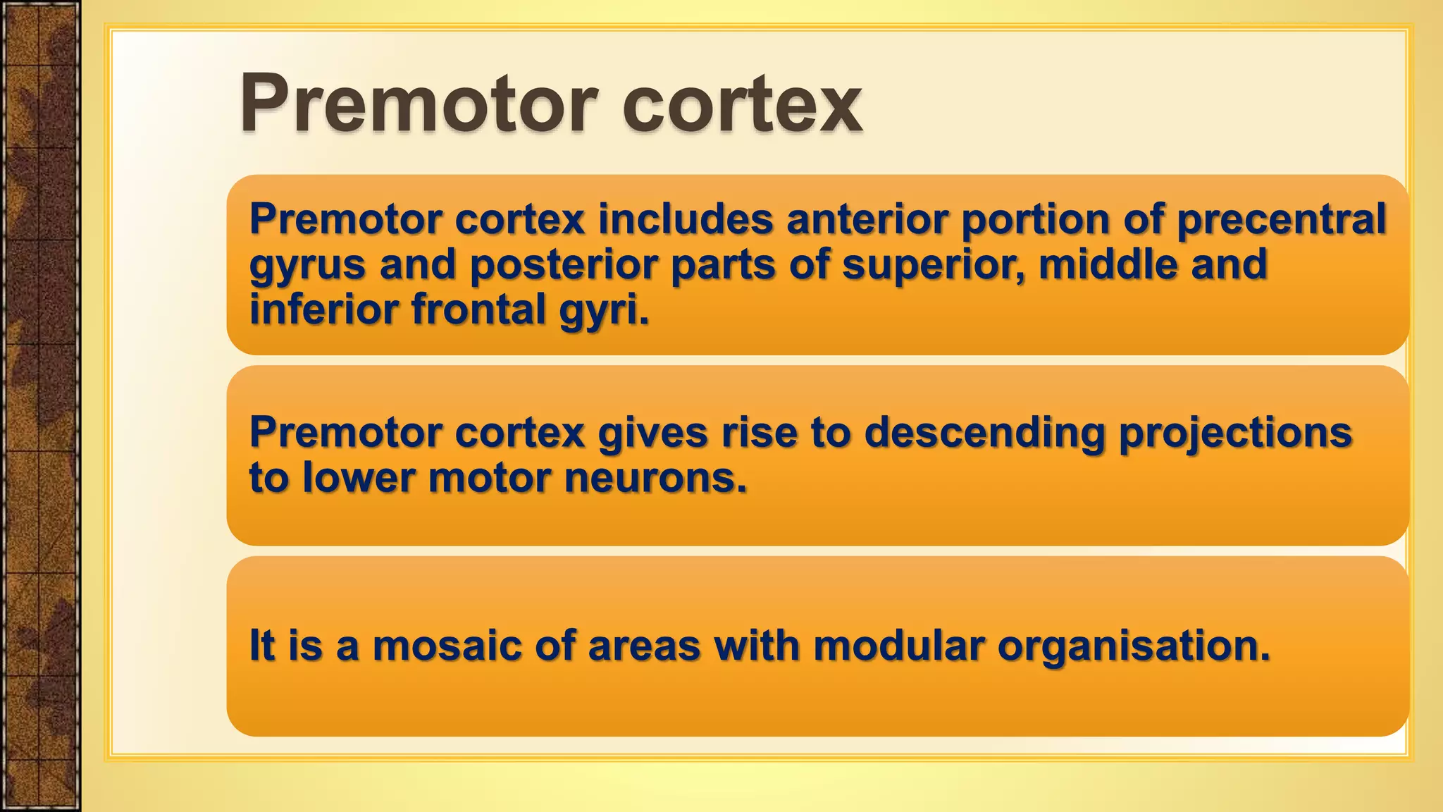 This document summarizes the premotor cortex, brainstem, and emotional motor systems. It describes the anatomy and functions of the premotor cortex, including its medial and lateral divisions. The brainstem discussion focuses on the vestibulospinal and reticular formation tracts, which are involved in posture adjustment and sensory integration. The emotional motor systems section contrasts the voluntary pyramidal pathway with the extrapyramidal projections originating in limbic structures that activate specific emotional behaviors and gain setting.