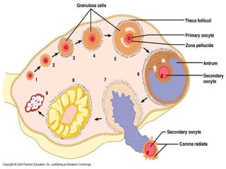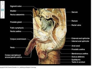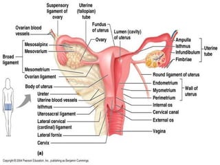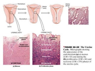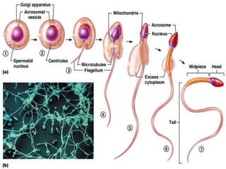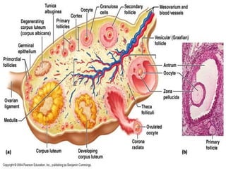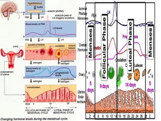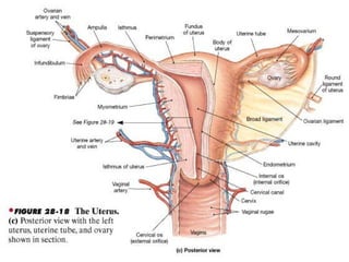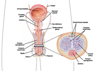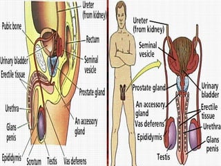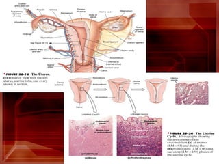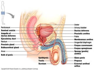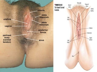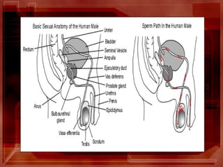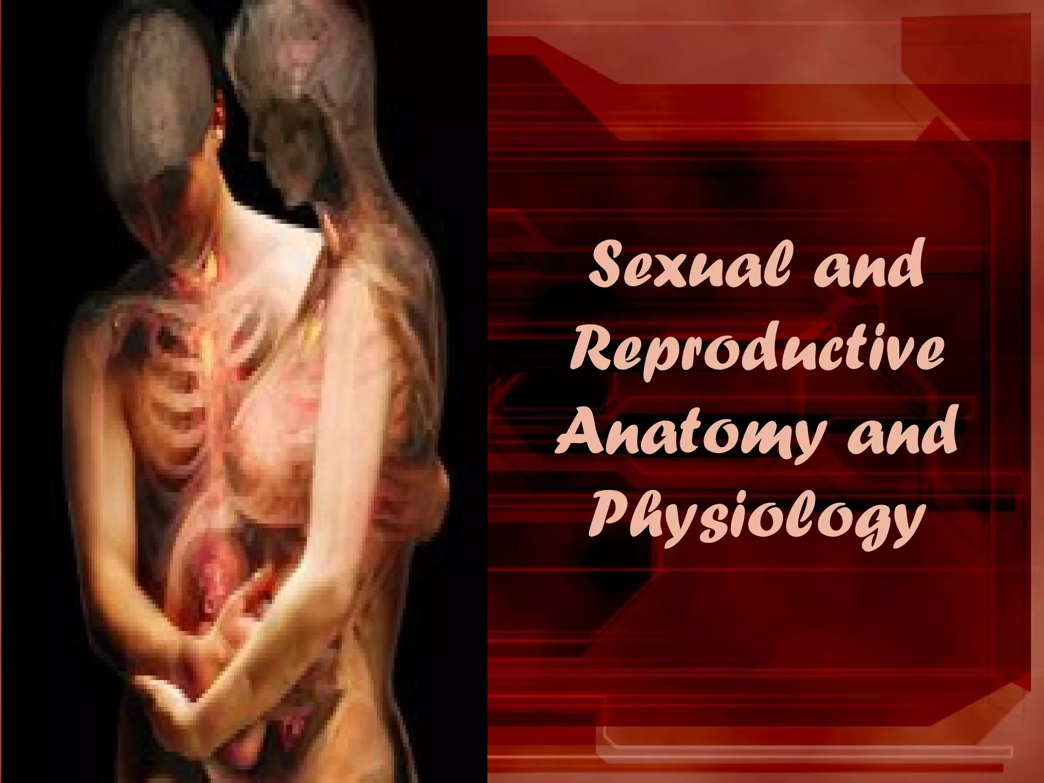 The document provides an overview of human sexual and reproductive anatomy and physiology. It describes the key functions and roles of both the male and female reproductive systems. The male's role is to produce sperm and deliver it to the female tract, while the female produces eggs and provides a nurturing environment for fertilization and development. Both sexes produce hormones that influence sexual development and function. The document then goes into extensive detail about the internal and external anatomy of both male and female reproductive organs.