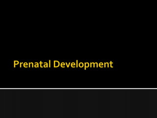 Prenatal development occurs in three periods: the period of the ovum from conception to 2 weeks, the period of the embryo from 2-8 weeks, and the period of the fetus from 8 weeks until birth. During the period of the ovum, the fertilized egg undergoes cell multiplication and implants in the uterus. In the period of the embryo, major organs and bones form along with the placenta, amniotic fluid, and umbilical cord to provide nourishment. By the period of the fetus, organs mature and the baby begins moving, sucking its thumb, and hiccupping.