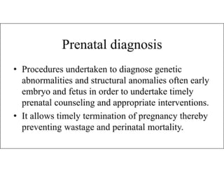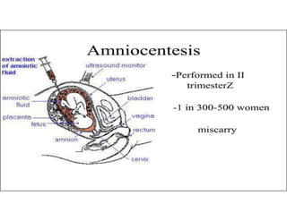 This document discusses advanced maternal age and the risks associated with pregnancy after age 35. It notes that while most women over 35 have healthy pregnancies, the risks of complications like preeclampsia, premature birth, and genetic disorders increase with age. Specifically, the risk of Down syndrome rises with maternal age. The document also outlines various prenatal tests that can assess the health of the fetus and screen for potential issues.