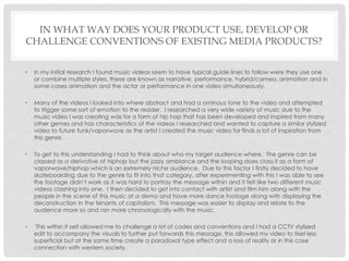 The document discusses how the author used new media technologies during the construction, research, planning and evaluation stages of their media production. They used a blogger site to document their research and analysis of music videos for inspiration. They also used YouTube to find old and new music videos within relevant genres for additional inspiration. However, the author notes they could have explored additional sites like Vimeo for a wider range of videos. Facebook was also used to organize filming events and locations. Overall, the author leveraged online resources at various stages of their project, but recognizes exploring more platforms could have provided additional creative insights.