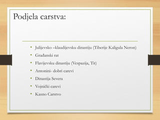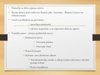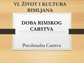 Dokument opisuje život i kulturu Rimljana tijekom Rimske imperije, uključujući preobrazbu i podjelu carstva. Ističe važnost Dioklecijanove tetrarhije i njegovih reformi, kao i vladavinu Konstantina koja je donijela vjersku toleranciju i jačanje kršćanstva. Također se naglašava ekonomska i kulturna moć istočne polovice Rimskog carstva u usporedbi sa zapadnom.