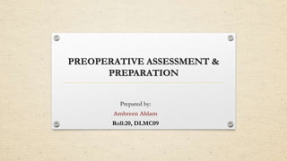 The document discusses the key aspects of preoperative assessment and preparation. It outlines the goals of preoperative assessment as reducing risks, identifying existing medical conditions, and planning management. A thorough assessment involves taking a medical history, physical exam, evaluation of systems like cardiac, respiratory and more. Proper preparation includes discussing the procedure with the patient, obtaining informed consent, giving instructions, and ensuring readiness in the operating theater. The overall aim is to minimize complications and optimize outcomes for the patient's surgery.