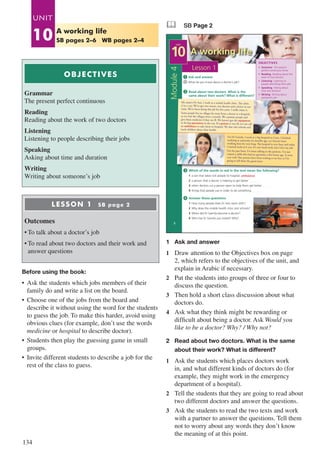 This document provides the objectives, outcomes and lesson plan for a lesson about doctors' jobs. The lesson includes reading about two doctors, Dr. Aziz who works in a mobile health clinic and Dr. Gamila who works in a hospital. Students will listen to interviews with three people about their jobs - a chemist, dentist and archaeologist. They will also practice asking and answering questions using the present perfect continuous tense and do an internet search about a job of their choice.