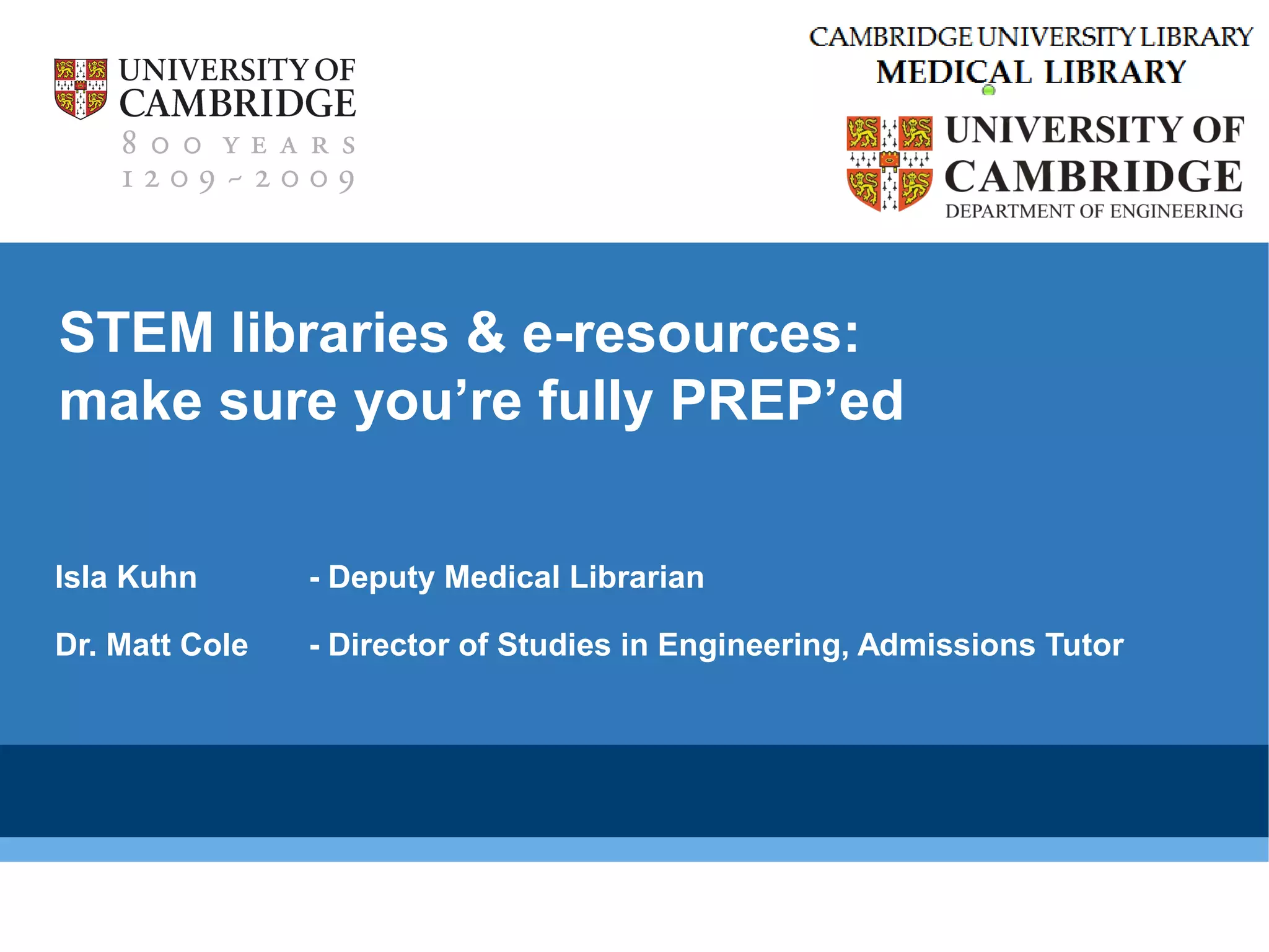 This document provides information about library resources available at Cambridge University for STEM subjects. It discusses the various libraries located across the university's colleges and departments, and the digitized resources and catalogs that provide access to over 7 million books and other materials. It also summarizes tools for keeping track of readings, references, and research as well as resources for accessing materials while working remotely or on campus.