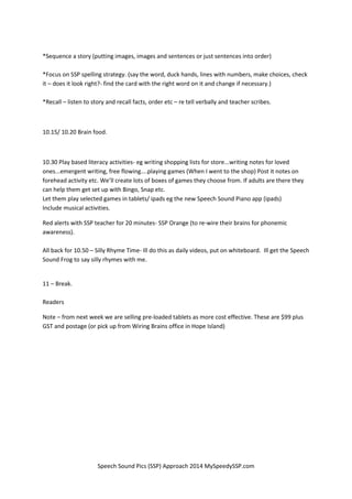 The document outlines a structured plan for prep teachers implementing the Speech Sound Pics (SSP) approach starting from term 2, emphasizing daily routines and various activities focused on sound recognition, spelling strategies, and literacy. It includes guidelines for adult involvement, paired activities, and play-based learning, alongside the distribution of pre-loaded tablets with a variety of reading materials. The initiative aims to enhance phonemic awareness and writing confidence in young learners through engaging, tailored exercises and resources.