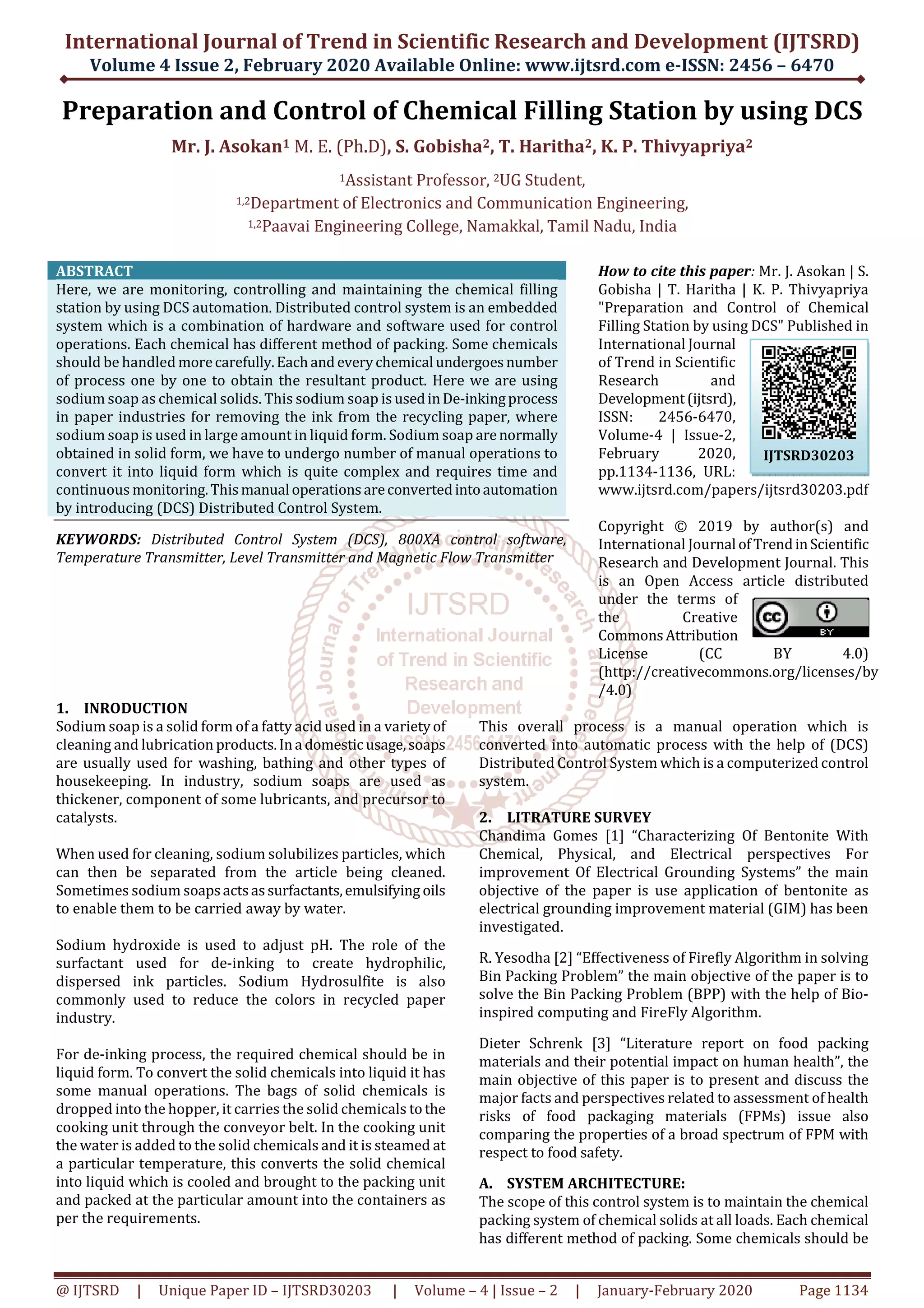The document discusses the implementation of a Distributed Control System (DCS) for monitoring and automating chemical filling stations, particularly for sodium soap used in de-inking processes in the paper industry. It highlights the complexity of converting solid sodium soap into liquid form and how DCS technology streamlines this process by reducing manual operations. The study presents an overview of the system architecture, necessary hardware, and the programming languages utilized for control applications.