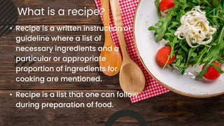 The document discusses proper food preparation techniques and maintaining kitchen hygiene. It provides guidelines for writing recipes with accurate ingredient measurements and cooking instructions. Various cooking methods are described like boiling, frying, baking, etc. along with their appropriate temperatures. The importance of using proper equipment and fresh ingredients is emphasized. Finally, tips are given for adopting carefulness in cooking like minimizing vitamin loss, avoiding cross-contamination, and keeping a clean kitchen.