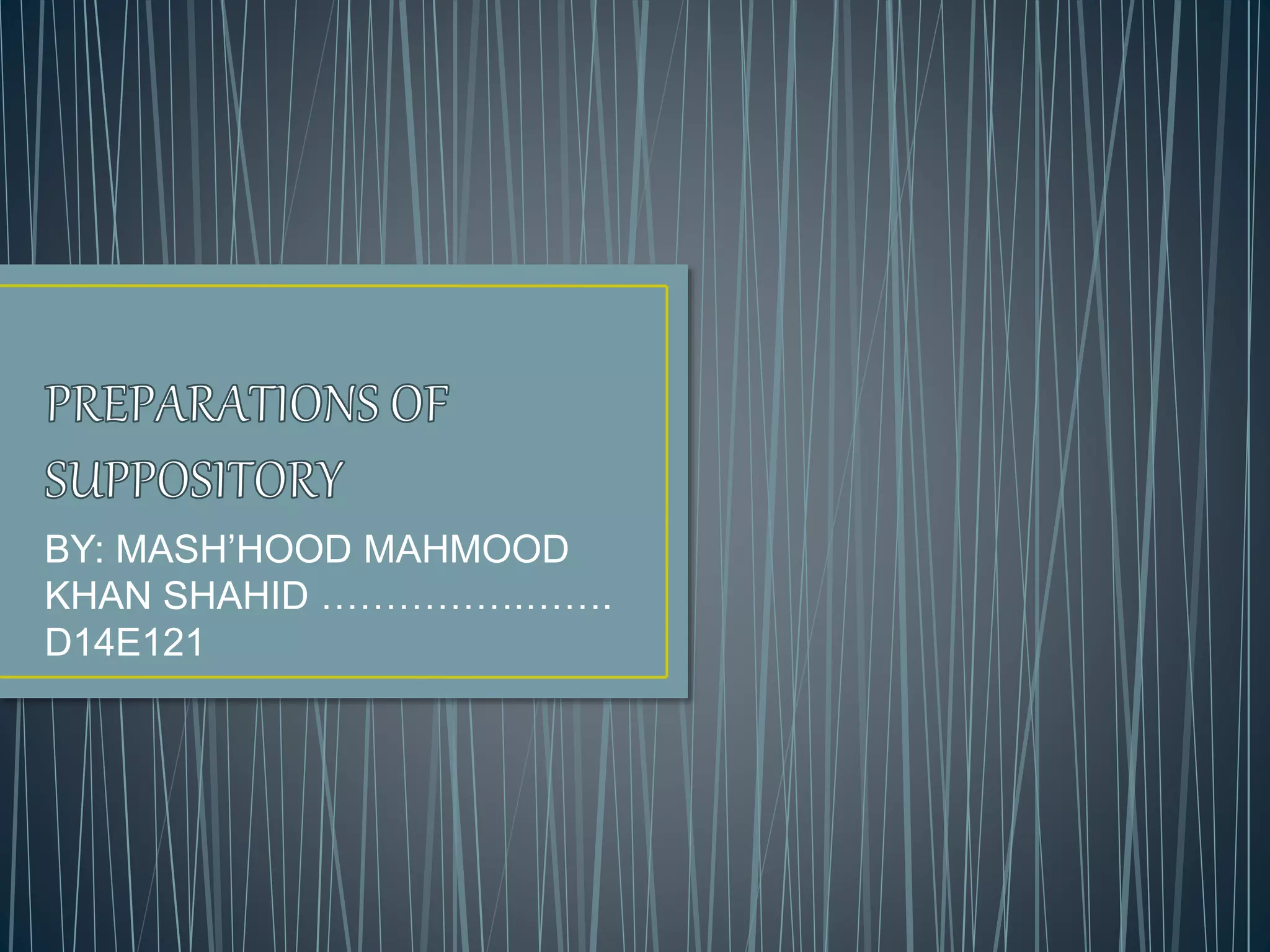This document discusses four methods for manufacturing suppositories: hand rolling, compression molding, fusion molding, and automatic molding. Hand rolling is the oldest and simplest method, involving mixing the drug powder into a suppository base and manually rolling it into rods that are then cut. Compression molding compresses the drug-base mixture into molds using a machine. Fusion molding involves melting the base, adding the drug, and pouring the mixture into molds. Automatic molding is the modern method using a machine to completely mold suppositories at high volumes.