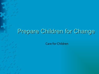 This document discusses strategies for preparing children for changes, such as staff changes, moving rooms, starting school, or unexpected life events. It emphasizes informing children about upcoming changes, giving them notice, allowing time to adjust, and involving them in decisions when appropriate. Some key strategies mentioned include explaining changes honestly, using symbols and rituals, building confidence, reading stories, and setting up dramatic play areas to help children understand different situations.
