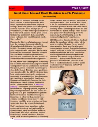 The Utah Department of Health's Bureau of Emergency Medical Services and Preparedness recently reorganized due to personnel changes and budget issues. Key staff members retired or moved to new roles. The Bureau is now divided into EMS and Preparedness sections, with training and exercises combined under a new Professional Development program. Utah also developed pandemic triage guidelines to prepare for situations where hospital demand exceeds capacity, which may require denying some patients life-saving treatment based on likelihood of survival. These guidelines sparked ethical debates but are intended only for declared public health emergencies. Utah representatives attended a national public health preparedness summit to discuss lessons from H1N1 and strategies for engaging communities during emergencies.