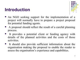 The document provides guidance on preparing an effective project proposal for potential funding agents. It recommends including an introduction describing the applicant's qualifications, a clear problem statement supported by evidence, goals and measurable objectives, a description of activities and timeline, plans for monitoring progress and evaluating outcomes, and a strategy for sustaining project activities after funding ends. A checklist is also provided to help ensure all necessary components are addressed concisely and clearly in the proposal.