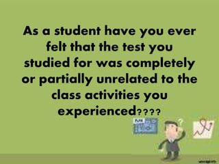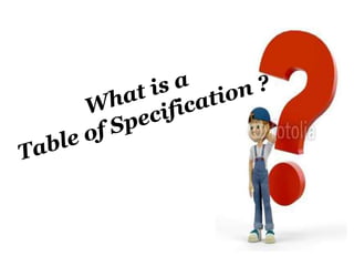 The document discusses the importance and process of creating a Table of Specification (TOS) for constructing tests. A TOS is a two-way chart that describes the topics and objectives to be assessed on a test and the number of items or points associated with each. It helps teachers ensure their tests have content validity by covering the appropriate material. The key steps in preparing a TOS include identifying topics and objectives, determining time spent on each topic, calculating the percentage allocation for topics, and distributing test items to objectives based on importance.