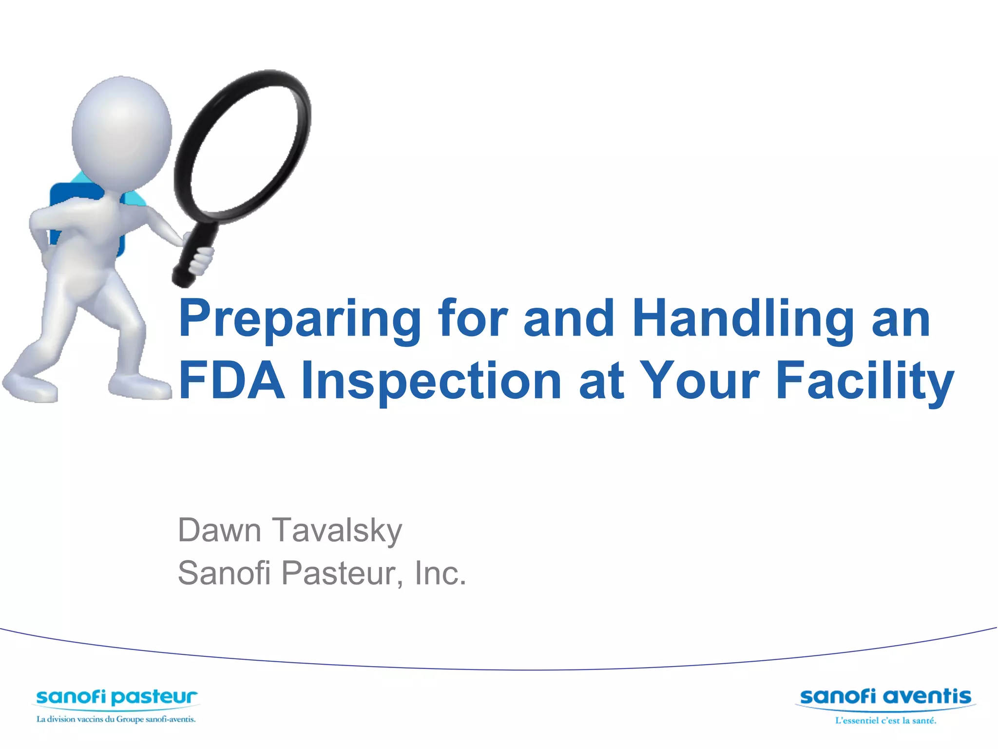 The document discusses preparing for and handling an FDA inspection at a facility. It covers the FDA's authority to inspect facilities and outlines the different types of inspections including routine, concise, follow-up, special, and quality systems reviews. It also discusses the inspection process, providing details on the frequency, duration, and whether inspections are announced or unannounced. Tips are provided on how to prepare for an inspection, what to do during an inspection, and what information is allowed and not allowed to be shared with FDA inspectors.
